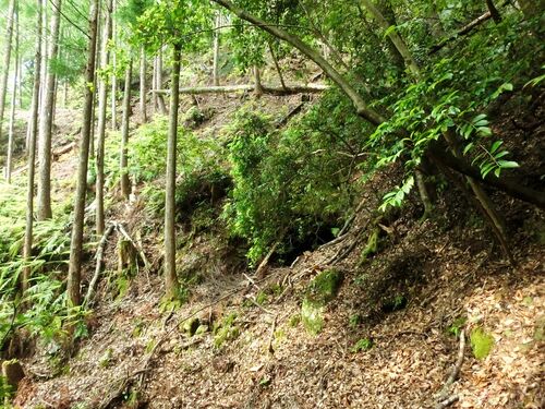 翌朝、昨日敗退した地点より少し進んだところで斜面に突入する。ちょうど写真の左端のあたりである。 そして昨日降りることが出来なかった崖の下に到達する。その先は緩やかな坂になっており、すぐに分岐が現れる。まっすぐな道と上に向かう坂道だ。 この時…