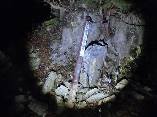 ただ今12月の朝6時、林道終点地点であります。夕方6時までに職場に戻らないといけないため朝1で突入。さすがにまだ暗い。 今日は軌道跡ではなく川沿いに進みショートカット、路盤上からは見えない石垣を横目に全速前進!目指すのは・・・ ずばり、例の砂…