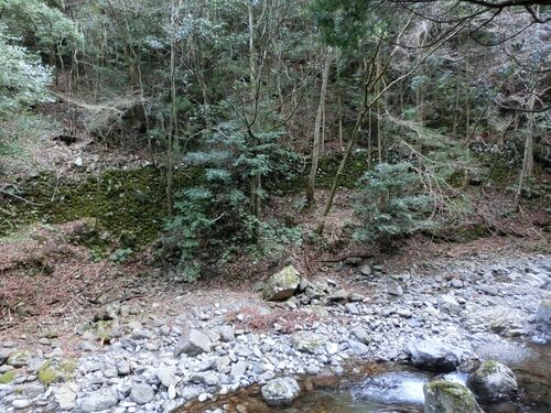 川の向こう岸に石垣が見える。つまり、林道に潰されていない軌道跡が残っているのだ。これは個人的に一番うれしいパターンだ。手つかずの軌道跡を歩いて楽しむのと、側面から眺めて楽しむのと、両方楽しめるからだ。 川幅が狭まったところで渡河して路盤によ…