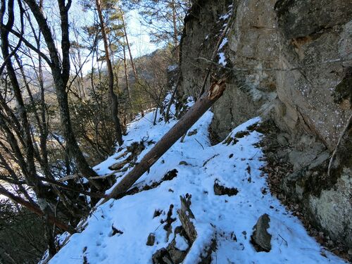 右(下流方向)を見る。木のせいで微妙に見通しが悪い。 まずは上流方向へ向かってみる。雪は適度に積もっており凍結もしていないが油断はできない。慎重に歩を進める。 軌道は小さな切り通しを右に曲がりながら抜けていく。 浅い谷間に出た。 こちらの谷はエ…