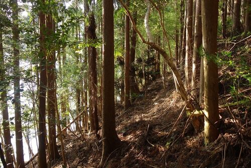 湖面にほど近い斜面を歩いて荒谷の出合いを目指す。 写真を撮ってなかったので記憶があやふやだが、確か出合い付近で斜面をよじ登って撮ったのが上の写真。木馬道だ。 発見した木馬道を上流へと歩き始める。 木馬道は綺麗で崩落もない。 崖を削り石垣を組ん…