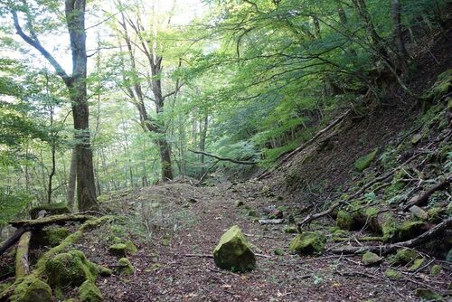 ゲートを越えて歩き始める。多少落石や倒木があるようだ。 多少じゃなかった。崩落地点では大きな石がごろごろ転がっている。はるか手前で通行止めになっている以上、奥地も整備されていないので仕方がないが。 この辺まで来た。ぐるりと周って再び川上へと…