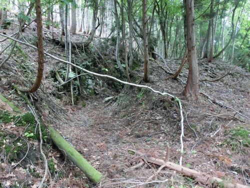 インクラインの跡がはっきりしてきた辺りから上を見上げても終点である上部軌道は確認できない。 横から見て 下を見て レールを発見して 直登すること25分、上部軌道にたどりついた。全体的に土に埋もれつつあり、写真右上の石垣ぐらいしか人工物が見当た…