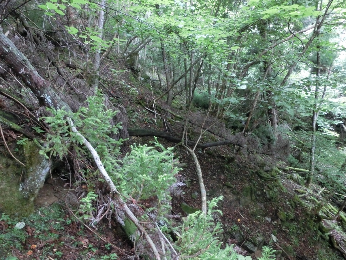 そしてレールの向こう側のなにか道っぽく見えるところは多分上部軌道への通勤路。つづら折りを少し降りたあたりで道の痕跡は消えていた。