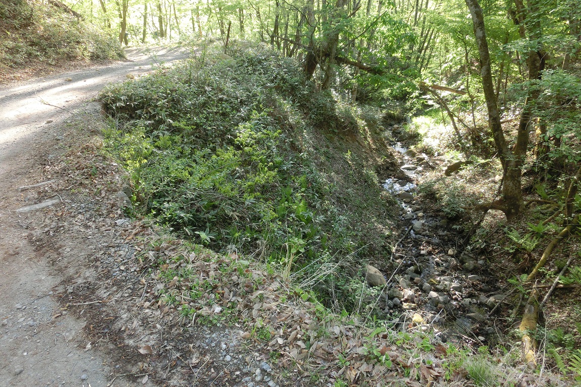 川辺まで降りていく軌道跡。ちなみに旧軌道はS字を貫いて真っ直ぐ下っている。