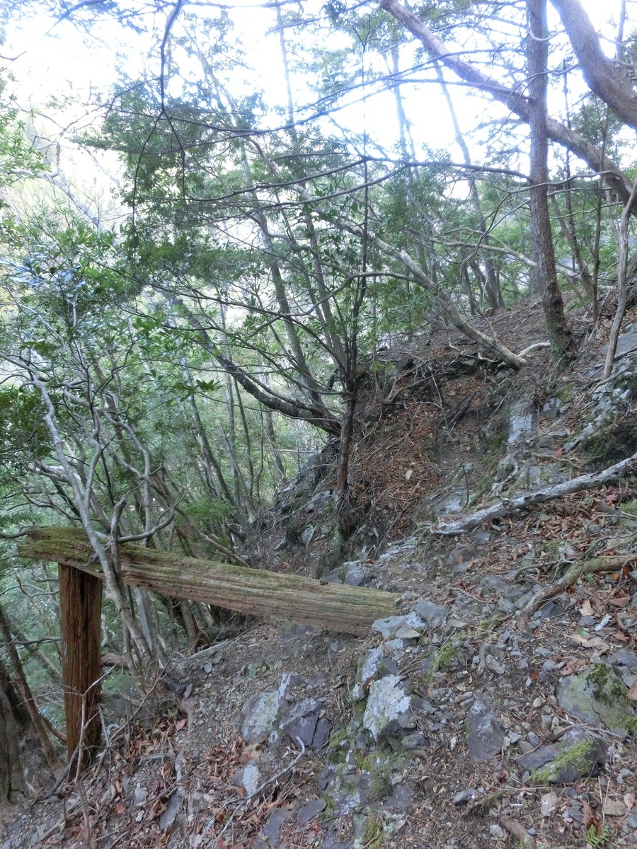 ほんの一組の木材の組み合わせだが間違いない。桟道(崖や斜面に棚のように張り出して造られた道)の一部だ。自分にとってはお宝発見である。よく残っていてくれたものだ。そしてここや先ほどの斜面は崩れていたわけではなく、桟道で越えていたのだろう。