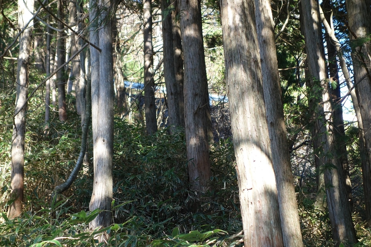 下を覗き込むが熊笹のせいで地表が見えない。少し計算違いだ。築堤や掘割とまでは期待していなかったが、地面がろくに見えないとなると流石に無理だ。